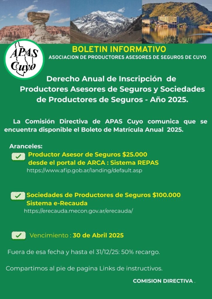 La Superintendencia de Seguros de la Nación (SSN) estableció el importe a abonar en concepto del “Derecho Anual de Inscripción” de los Productores Asesores de Seguros (PAS) correspondientes al año 2025.